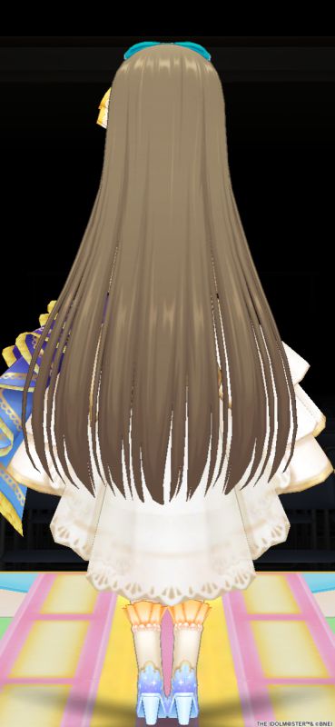 白を基調にしたワンピース水着に、カラフルな貝やサンゴやヒトデなどをあしらった可愛らしい衣装です。朱色のリボンが和風で芳乃ちゃんらしいですね。髪型がウェーブのかかった2つくくりになっていて、黄色の大きなリボンが溌剌としてとても可愛らしく、横髪の留め方や前髪のセットがいつもよりサッパリしていて夏らしいのもポイントです。