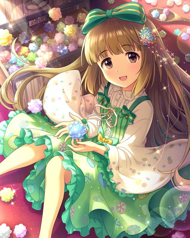 [めぐみの甘雨]の特訓後の衣装ですね。優しく明るい緑色の和風ロリータがとても可愛いです。ぽってりとしたこんぺいとう柄の振袖が可愛いですし、お人形のような姿で動いているところを見れたらと想像するとたまらないですね……。