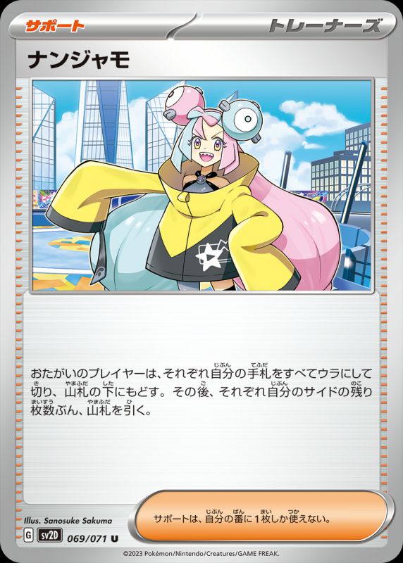 パルデア地方のジムリーダー、ナンジャモがポケモンカードゲームに初登場。おたがいのプレイヤーは手札を山札の下にもどし、それぞれサイドの残り枚数ぶん、山札を引くという効果だ。