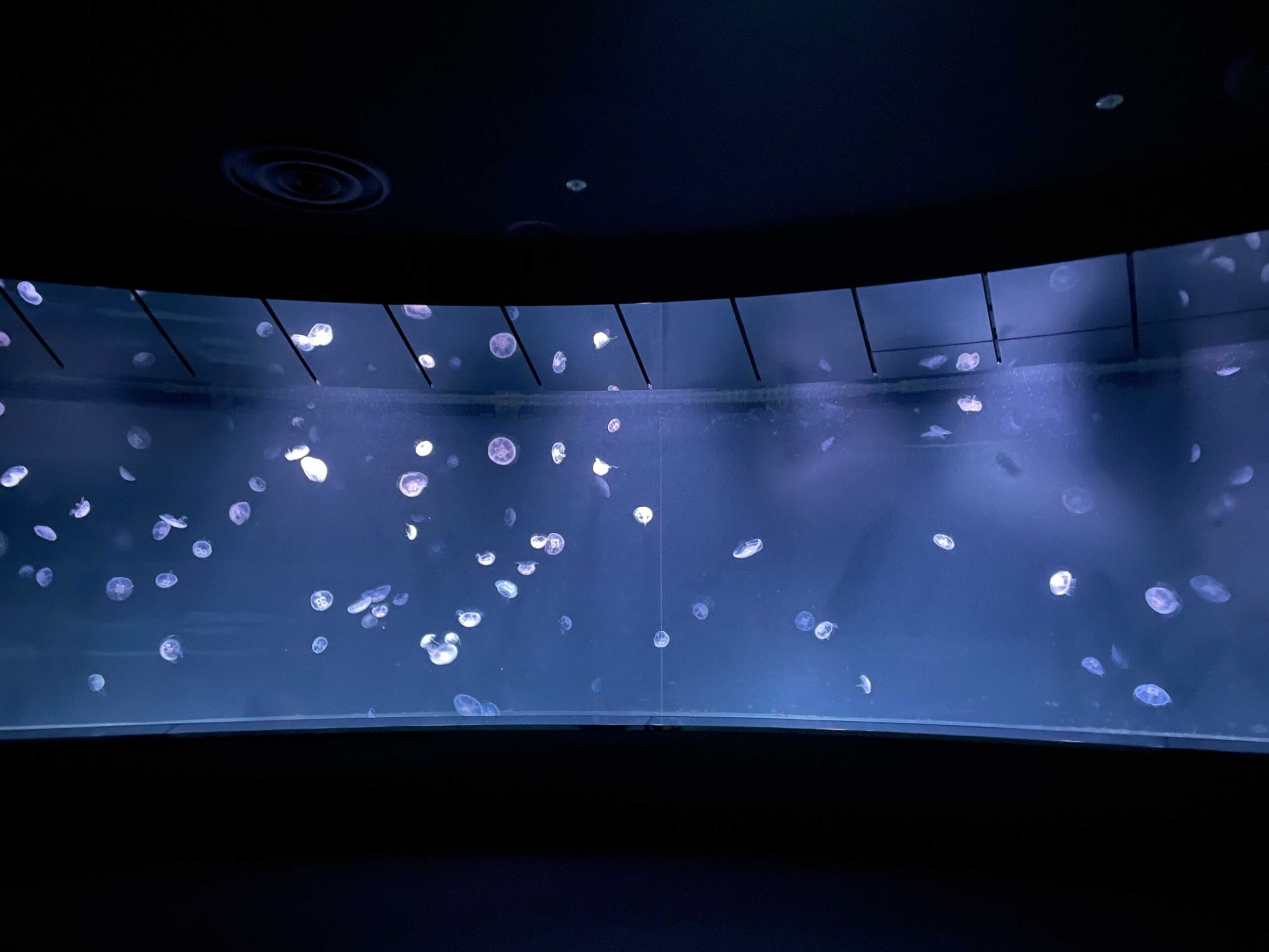 クラゲの水槽自体も本当に海が広がっているかのような奥行きを再現していたり、ミラーを使い空間を大きくみせるための工夫や天井に水面を再現した小窓などがあり、非常に見応えがあって圧倒されました。