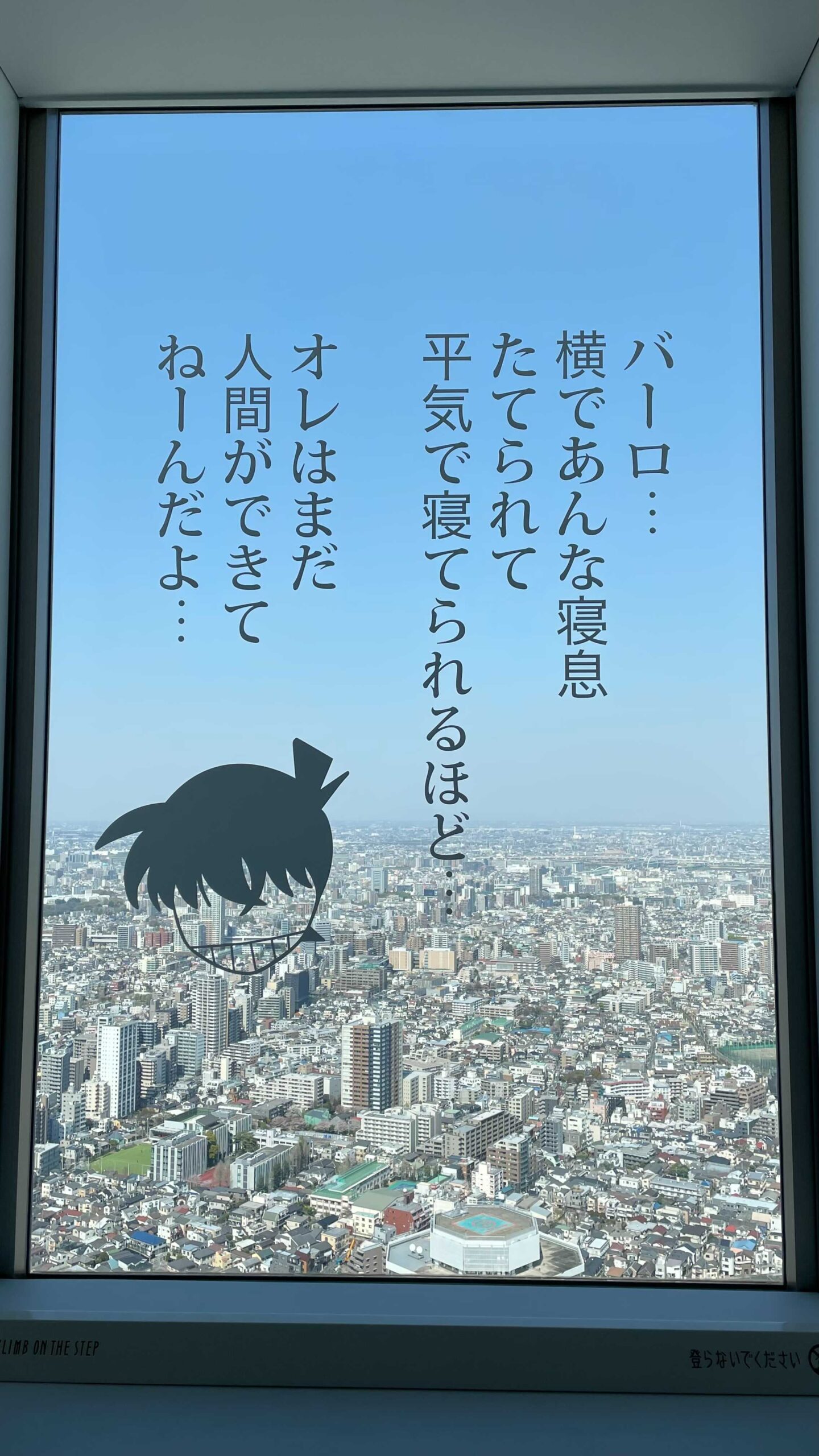 また展望台の窓にはコナンのキャラクターの名台詞が書かれている窓もあるので、自分の推しキャラのセリフをバックに撮影も思い出深いです。
