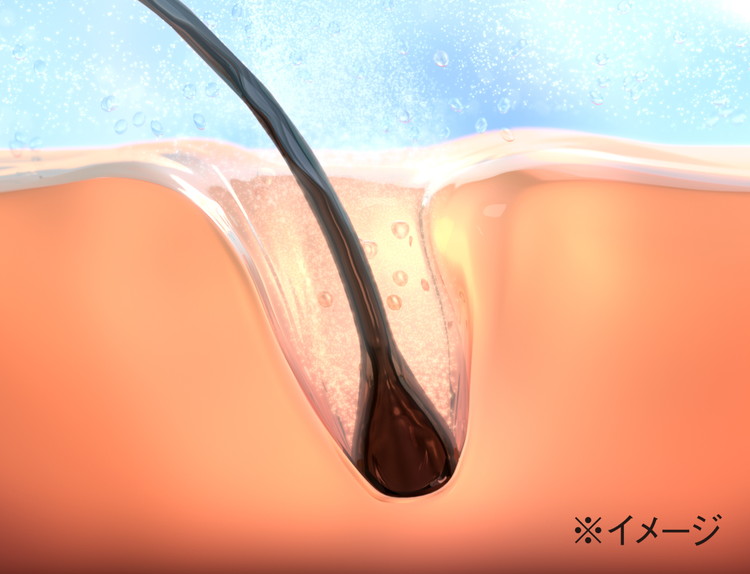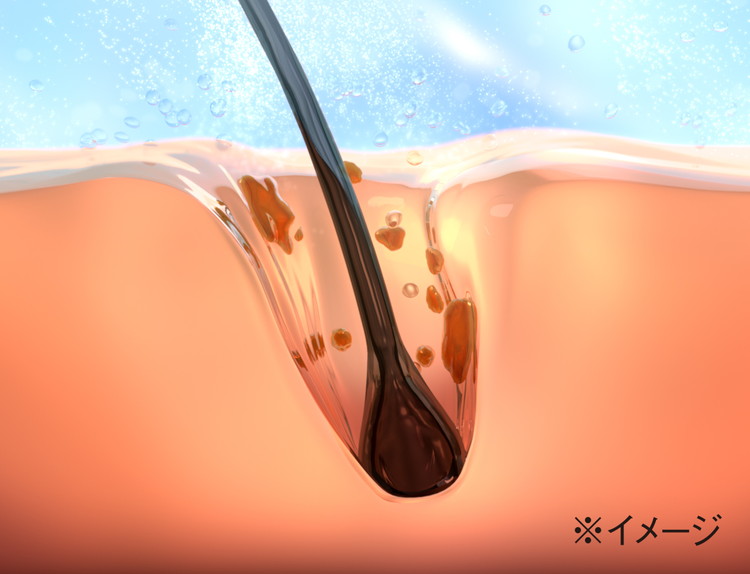 ウルトラファインバブルは毛穴の奥まで入り込んで汚れを取りのぞき、マイクロバブルが毛穴につまった大きな汚れを浮かせて取りのぞきます。