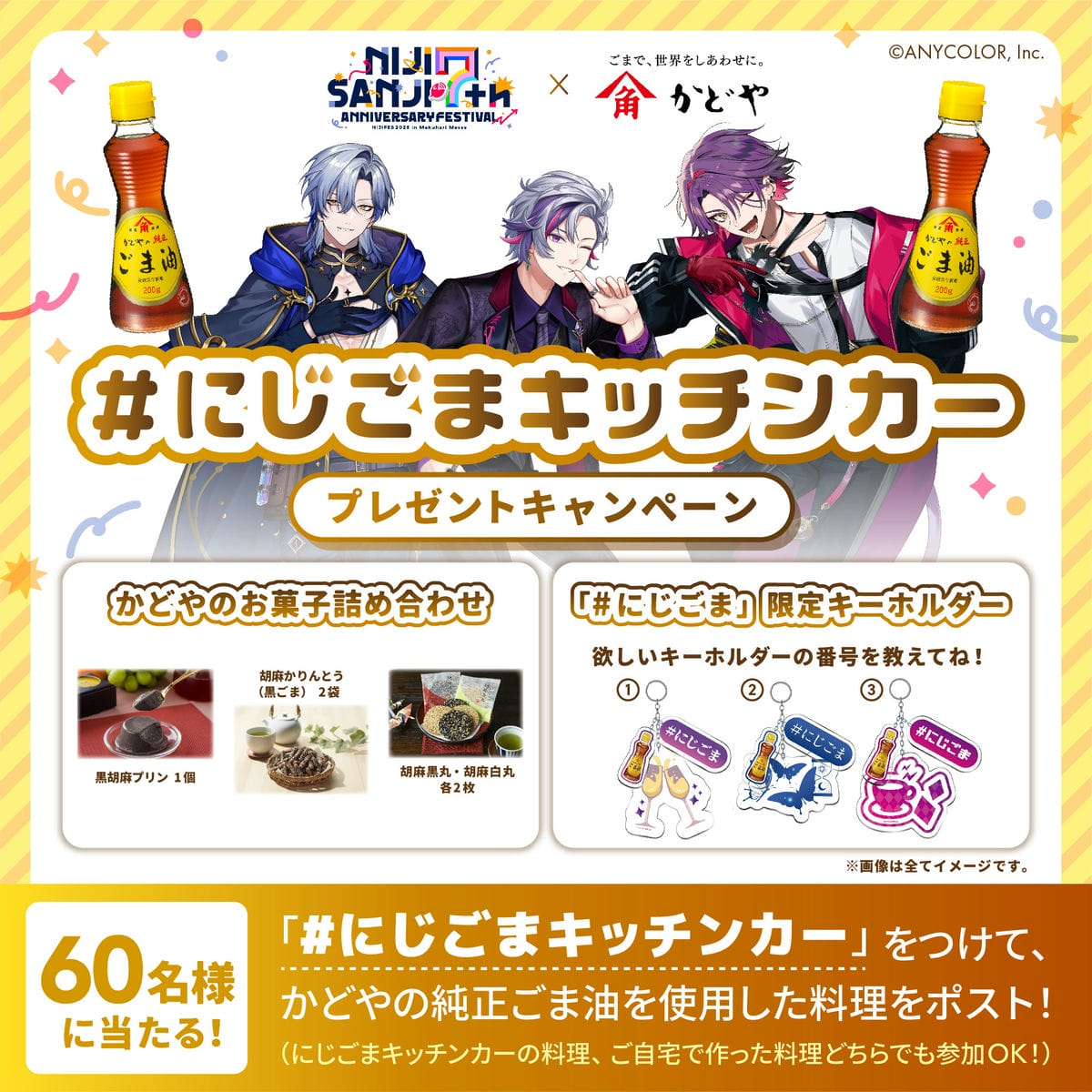 かどや製油公式 X にてキャンペーンを実施します。「かどやのお菓子詰め合わせ」と「#にじごま限定キーホルダー」をセットにして抽選で60名様にプレゼント!ぜひ奮ってご応募ください!