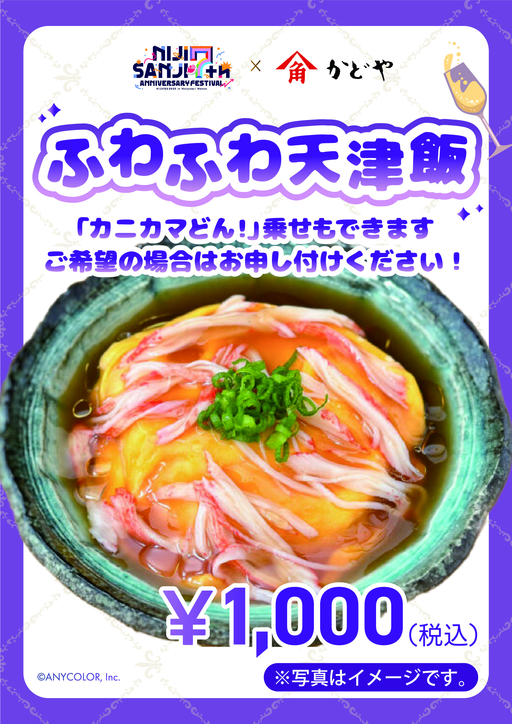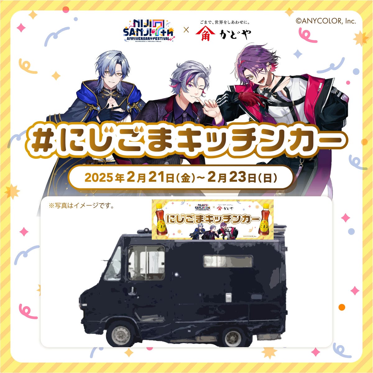 2025年2月21日(金)〜23日(日)に幕張メッセで開催される「にじさんじフェス 2025」にて、かどや製油がキッチンカーを出店いたします。この「にじごまキッチンカー」では、にじさんじに所属する、不破湊さん、ミラン・ケストレルさん、渡会雲雀さんのおすすめレシピを再現し、限定販売いたします。さらに販売されたフードにはかどやのごま油を注ぎ放題コーナーが登場いたしました。