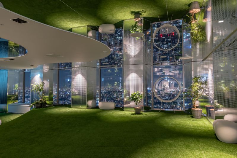 白い雲をイメージしたトンネルをくぐった先には、ここが60階のビルの中なのかと疑いたくなるくらいの芝生の空間が広がっています。