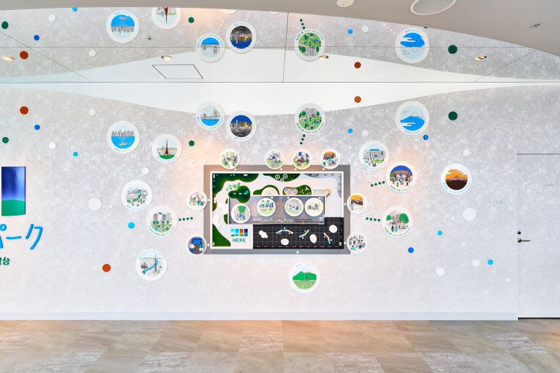 入ってすぐのエントランスには、イラストレーターの米村知倫(よねむら としのり)さんによって描かれたてんぼうパークのイラストマップがあります。このイラストマップは館内のマップとしての役割だけではなく、各方面に見える景色も一緒に描かれています。